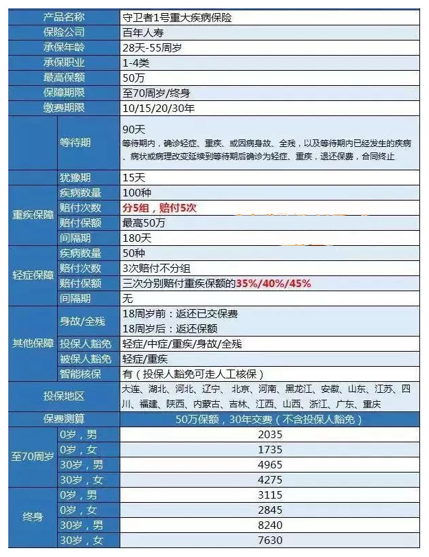 百年人壽守衛(wèi)者1號重疾險保障內(nèi)容分析