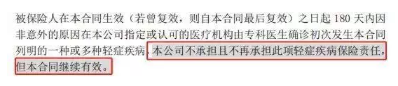 這意味著保險單在等待期間確認為輕癥,而保險公司此時不是理賠,而是輕癥,但不會取消合同。如果發(fā)生輕癥并且合同終止,則不僅意味著理賠,而且將來也意味著保障。雙保護條款非常人性化,雖然這次輕癥不是賠付,但是合約沒有結束,保障總是存在的。