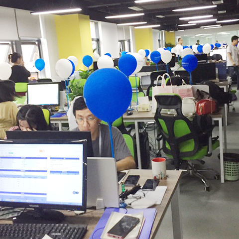(公司整個工位上都放有藍白相間的氣球,遠遠望去就像一片藍藍的大海一樣,也希望多保魚這條小魚在互聯(lián)網(wǎng)金融的大海之上乘風破浪,勇往直前。)
